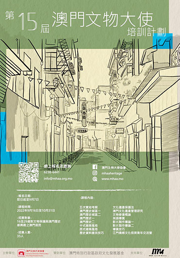由澳門文物大使協會主辦,文化發展基金資助,M軸空間支持的「第十五屆澳門文物大使培訓計劃」現正接受報名,本次活動共招收三十五名學員,並進行共計68學時的培訓。課程內容涵括澳門歷史、澳門歷史城區介紹、中西式建築風格等課題,亦加入有關《文化遺産保護法》、文化遺產管理等研究及英語導賞等技巧,讓學員在掌握本澳基礎文史知識的同時,對現行的文化保育情況亦有更深入的了解,促進學員日後對文史相關範疇的研究興趣,並掌握一定的導賞技巧。