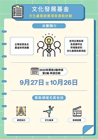 【特訊】文化發展基金推出2022年第二輪“文化產業商業項目資助計劃”,商業企業主可於9月27日至10月26日期間提出項目申請。