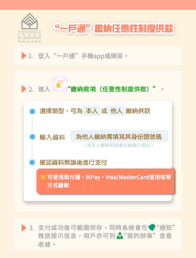 即日起,任意性制度受益人可於供款月內登入「一戶通」手機應用程式或網頁(https://www.mo.gov.mo/home),憑澳門居民身份證編號,使用政付通內的電子支付工具、MPay澳門錢包及信用卡繳納任意性制度供款,方便快捷,亦可透過指定銀行的電子渠道及櫃枱、銀通網絡自動櫃員機、貼有社保供款標籤的自助服務機、市政署轄下市民服務中心及分站,以及社保基金各服務點繳款。