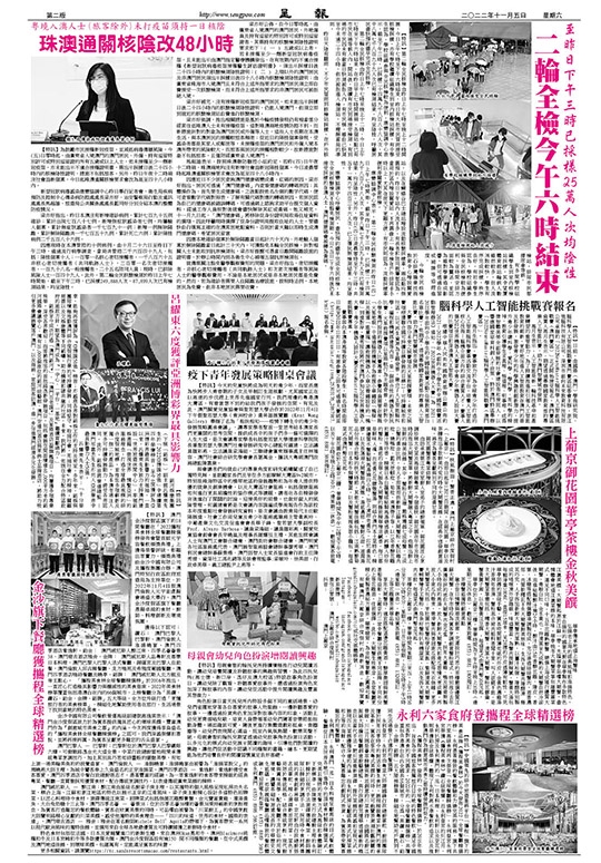 澳門威尼斯人 — 醉江南;醉江南由星級名廚梁子庚主理,以其獨特的個人風格呈現私房功夫名菜,糅合上海、江蘇和浙江地區的特色以展示正宗的江南風味。梁子庚主廚精心設計多道特色招牌菜,以匠心料理時令食材,演繹傳統江南菜。招牌菜式包括無菌花雕醉膏蟹、金元寶富貴雞、灌湯黃魚、大白兔奶糖十三幺等。澳門四季名薈 — 薈景38;位於四季名薈38樓的薈景38秉持嶄新的烹飪理念,為賓客打造難忘的餐飲體驗。賓客在欣賞美景的同時,可品嚐由被譽為「川菜廚王」的中國烹飪大師蘭明路精心呈獻的川菜美饌,感受他獨特的美食理念——「四川的味道,世界的食材,國際的表達」。澳門瑞吉酒店 — 雅舍;雅舍在著名廚師Michele Dell’Aquila的帶領下,為賓客帶來一系列以現代歐洲風味的獨特佳餚,並選用來自全球各地最優質及可持續捕獲之新鮮時令食材。
