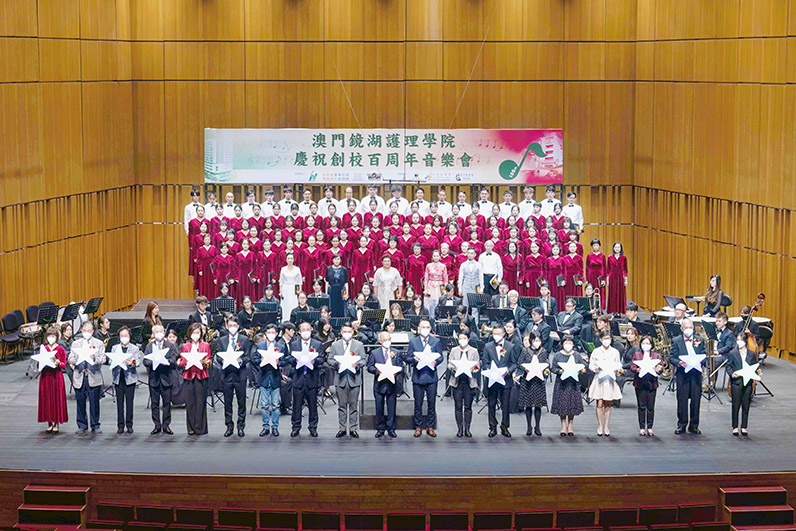 音樂會由鏡湖慈善會理事長、澳門鏡湖護理學院校董會主席劉永誠,中央人民政府駐澳門特別行政區聯絡辦公室副部長石書正,中華人民共和國外交部駐澳門特別行政區特派員公署辦公室主任、參贊付愛民,教育及青年發展局局長龔志明,文化局局長梁惠敏,社會工作局局長韓衛,交通事務局局長林衍新,人才發展委員會秘書長周昶行,財政局副局長何燕梅,永利關愛基金會主席陳志玲,澳門鏡湖護理學院校董會副主席蕭志偉、校董賀定一,鏡湖醫院院長吳培娟,鏡湖慈善會副理事長吳在權,衛生局護士總監陳穎茜,澳門管弦樂團指揮李鴻燦,學院院長尹一橋,校友會理事長李衛燕及學生會理事長賴宇桐主禮,為校慶活動亮燈揭幕,並與八百多位來自鏡湖慈善會、政府、高校和中學、實習機構、合作單位及社團的一眾代表和該學院師生員工、校友向鏡湖護院百歲生日致送祝福。