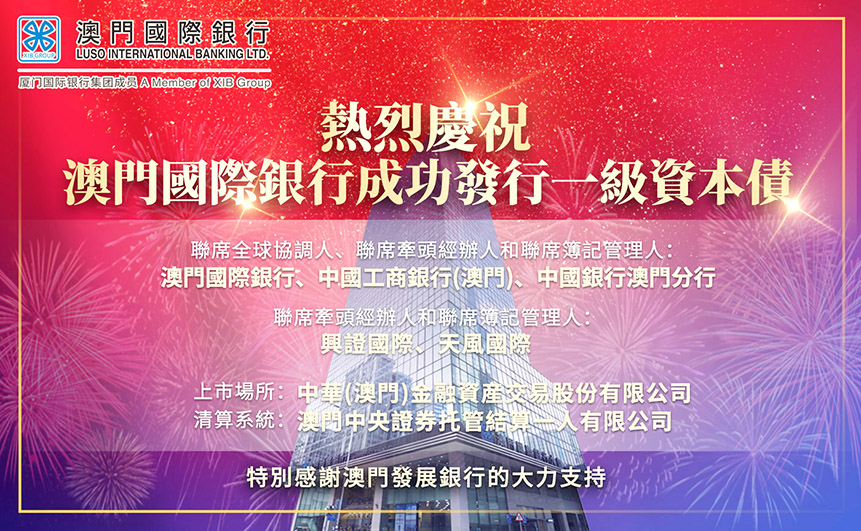 【特訊】2022年11月24日,由澳門國際銀行與中國工商銀行(澳門)、中國銀行澳門分行共同牽頭,並在澳門發展銀行的大力支持下,澳門國際銀行再次成功在澳發行一級資本債。11月25日,澳門國際銀行又以聯席全球協調人、聯席簿記管理人身份,大力推動廈門國貿控股集團有限公司成功在澳門特別行政區發行美元債券,及助力成都空港城市發展集團有限公司於上海自貿區成功發行西部地區首筆人民幣明珠債。在當前全球市場局勢複雜多變的環境下,澳門國際銀行始絡不懈努力推動澳門現代金融和人民幣國際化,善用跨境聯動優勢及熟悉資本市場運作的能力,成功補充資本以更好服務本地,並助力企業擴寬融資渠道,兩天內成功實現三筆債券於多地發行,發債總額達到38.88億等值澳門元,充分展示了澳門國際銀行專業的投資銀行業務能力和服務水平。