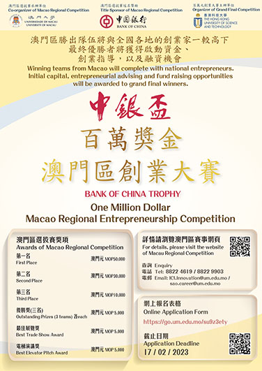 「百萬獎金創業大賽」於2011年由香港科技大學創辦,藉著發掘擁有最佳商業前景的方案。今年澳門區賽事共設立八個獎項,分別是第一名、第二名、第三名、優秀獎三名、最佳展覽獎和電梯演講獎,勝出隊伍將代表澳門與其他地區勝出隊伍切磋交流。