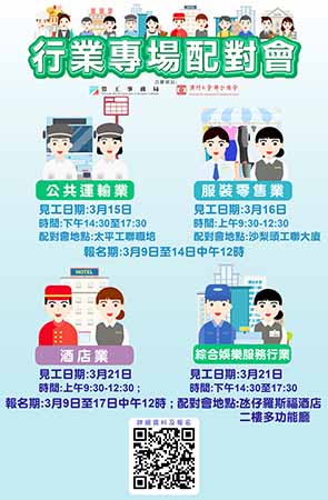 公共運輸業配對會在工聯職業技能培訓中心(工聯職業技能培訓中心)舉行;服裝零售業配對會在澳門工會聯合總會(沙梨頭海邊街2-6號工聯大廈)舉行,上述兩場配對會報名日期為3月9日起至3月14日中午12時;酒店業及綜合娛樂服務行業配對會在氹仔羅斯福酒店二樓多功能廳舉行,報名日期為3月9日起至3月17日中午12時。