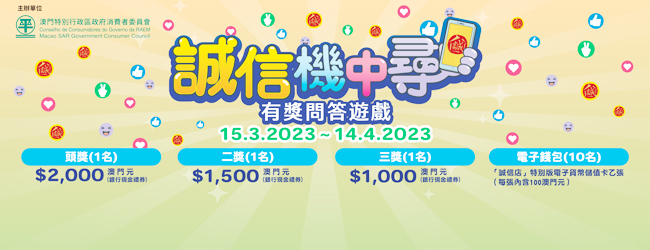 為增加獲獎機會,參加人士可於“誠信店”應用程式及消委會網頁(www.consumer.gov.mo)內找到問題答案。