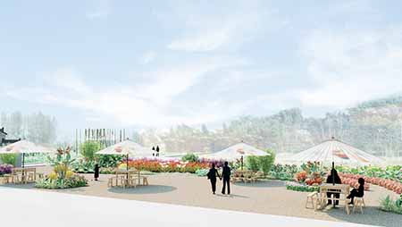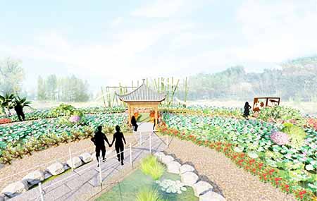 今屆荷花節主題為“九曲曉荷”,源於本澳盧廉若公園將與蘇州獅子林締結為姊妹園,兩園同屬江南園林風格,且均以園中九曲橋賞荷美景享負盛名,故本屆荷花節將分別透過古典及現代兩種不同的設計手法重新演繹“日出時分,九曲橋上賞荷”的經典畫面。為配合設計主題,龍環葡韻展場分為三個特色展區。第一展區為“古典園景區”:靈感取自獅子林和盧廉若公園中最獨特的景緻,例如九曲橋、水映亭台、獅子石林、特色景牆和漏窗等重新演繹,通過荷花將一幅幅景緻串連在一起;第二展區為“現代園景區”:通過現代設計手法,抽象粹取獅子林和盧廉若公園中石林的元素,造成一組組造型簡潔的藝術雕塑,與“古典園景區”中的石林形成鮮明對比,相映成趣,還有大氣的扇形拱門、載滿鮮花的接駕橋、現代屏風和竹林等,充滿新中式設計韻味;第三展區為“入口廣場”:此區域位於中心位置,設有茶座、花壇及植物組景,也為上述兩個區域的穿越提供適當的過渡。