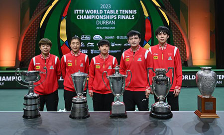 【香港中通社5月29日電】當地時間28日,中國選手孫穎莎在德班世乒賽女單決賽中以4:2擊敗隊友陳夢,獲得個人首座世乒賽單打冠軍獎盃。中國選手樊振東以4:2戰勝隊友王楚欽,成功衛冕世乒賽男單冠軍。至此,中國隊包攬本屆世乒賽五個單項冠軍。