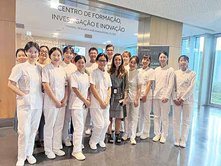 外訪活動於二〇二三年七月十日至二十一日舉行,鏡湖護院歐妙玲助理教授、黎想講師和黃潤洪講師帶領護理學碩士、專科及學士課程學生前往葡萄牙里斯本光明醫院進行交流。期間師生分組前往醫院多個部門及臨床科室學習,包括安寧療護病房、重症監護室、急診、內科、泌尿科、婦產科、手術室、兒童和青少年中心,以及心臟導管室等,並與當地護士交流討論,對比分析里斯本與澳門的護理模式差異。交流團還參觀了光明醫院的高仿真教學中心,了解當地醫教結合的教學模式,借鑒經驗以提升鏡湖護院的教學質量。