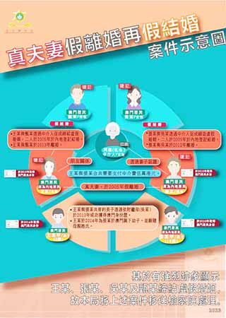 警方調查得悉,涉案的張姓男子及王女早在一九九七年結婚,至二零零四年由於想改善生活,透露「中介人」安排,合共支付了五萬港元的報酬,由「中介人」安排與澳門人假結婚。二零零五年中,張姓男子及王女離婚,同年底便各自與澳門人吳女及甄姓男子「結婚」,二零一零年各自取得澳門身份證,及後亦成功替兒子,現年已經十九歲,並取得澳門身份證。