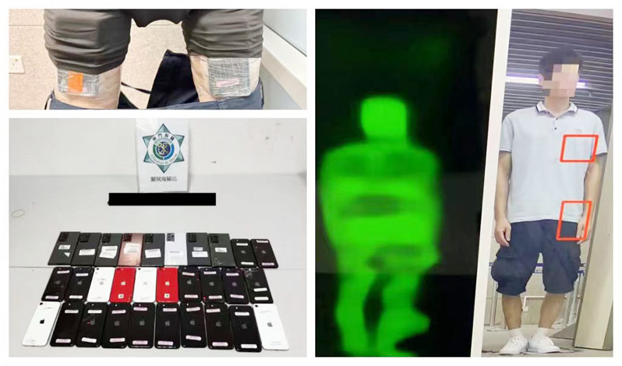 於十六日傍晚及晚上,海關關員在關閘口岸出境旅客檢查區分別發現兩名通關男子肢體動作不協調,混跡於離境人群中,懷疑身上藏有可疑物品,故進行截查,經使用太赫茲人體成像安檢系統詳細檢查後,發現上述兩人利用保鮮紙將合共六十部舊手提電話綁藏於腰間、胯下及大腿,試圖矇混過關。