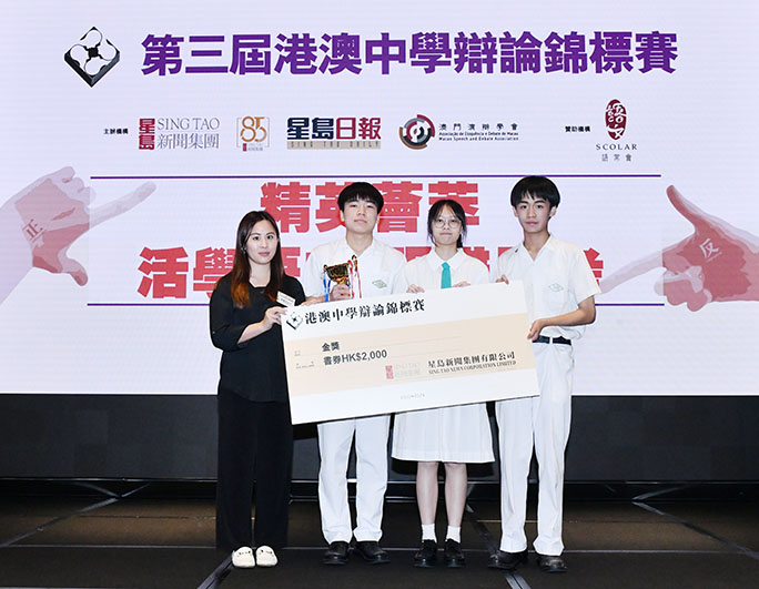 【特訊】由星島日報及澳門演辯學會聯合主辦,香港語文教育及研究常務委員會(語常會)贊助的「第三屆港澳中學辯論錦標賽」在早前舉行,澳門隊陳瑞祺永援中學及嘉諾撒聖心中學赴港比賽,在數據技術中心分別對戰香港隊聖馬可中學及聖保羅男女中學,最終,永援中學繼首屆賽事後再度奪得金獎,而在港澳代表各勝一場下,香港代表學校以1票之差險勝澳門代表學校,衛冕總冠軍寶座。