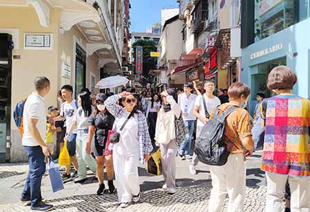 內地中秋、國慶假期將連休八天,早前旅遊局預料日均旅客量有機會達到十萬人次水平;而黃金周假期前夕,昨日(周日)市面人頭湧湧,中區板樟堂一帶人流暢旺;有手信商戶表示,已針對黃金周做好迎客準備;亦有小食店東主稱,已加大網絡平台宣傳推廣,希望人財兩旺。旅遊業議會會長胡景光表示,相信長假期旅客深入社區遊覽的意欲增加,業界已準備就緒迎客,截至目前酒店的整體預訂率達到七至八成,預計假期期間,酒店整體入住率或超過九成。