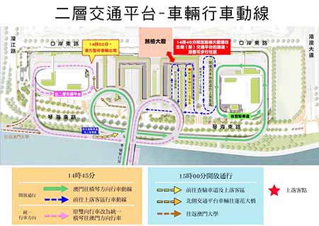 於十四時五十分,澳方及琴方暫停車輛出境,澳方出境車輛須從二層北側(新)交通平台前往新出境車道。