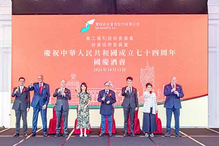 隨後,澳娛綜合董事局主席霍震霆、澳娛綜合常務董事何超鳳、澳娛綜合勞資協商委員會顧問代表黃景禧律師、董事蘇樹輝、董事兼福諮會主席梁安琪,聯同管理層與在場來賓及員工共同舉杯,祝願祖國繁榮昌盛,澳門經濟發展、和諧穩定。
