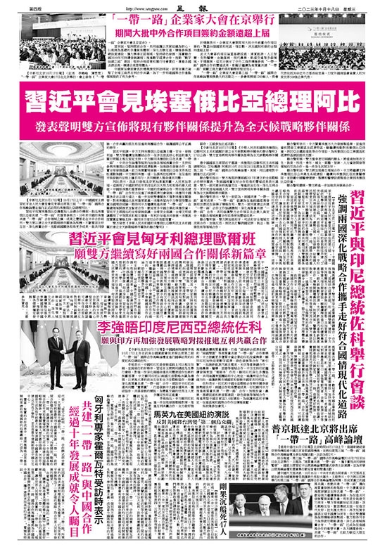 綜合報道,第三屆“一帶一路”國際合作高峰論壇於10月17日至18日在北京舉行,主題為“高質量共建‘一帶一路’,攜手實現共同發展繁榮”。國家主席習近平出席高峰論壇開幕式發表主旨演講,並為來華出席高峰論壇的嘉賓舉行歡迎宴會和雙邊活動。