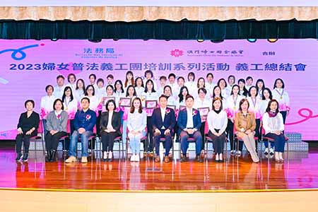 【特訊】由法務局與婦聯總會合辦的「二〇二三婦女普法義工團培訓系列活動」順利完成,今年共吸引近六十位婦女參與逾八個月的培訓課程。活動日前在婦聯綜合服務大樓五樓何賢禮堂舉行義工總結會,向四十一位結業學員頒獎嘉許,以資鼓勵。