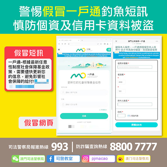 【特訊】司法警察局昨日(二十三日)接獲社會保障基金檢舉,指有人冒充社會保障基金發出釣魚短訊,內容以更新個人訊息為由,要求市民點撃短訊內附帶的連結,否則將會影響社保的給付。