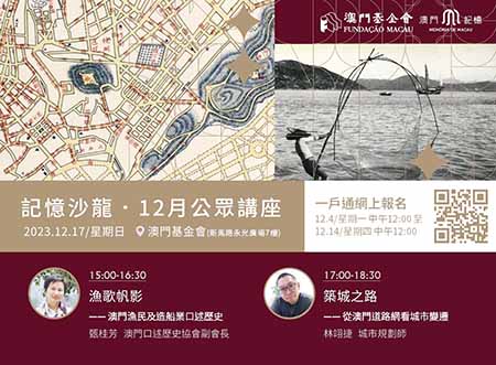 【特訊】澳門基金會開展的“澳門記憶”文史網於12月推出本年度最後兩場“記憶沙龍”公眾講座,分別由澳門口述歷史協會副會長甄桂芳主講“漁歌帆影——澳門漁民及造船業口述歷史”及城市規劃師林翊捷主講“築城之路——從澳門道路網看城市變遷”,將於12月4日中午12時開始接受報名。