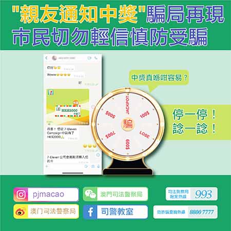 【特訊】司法警察局接獲市民檢舉,指收到“朋友”的Whatsapp訊息,稱事主於7-11便利店舉辦的抽獎活動中獲得獎金2,000元,要求事主提供信用卡照片及一次性驗證碼,以便將獎金存入事主的信用卡內。由於對方的頭像為其朋友,故事主相信並照辦,其後事主手機收到多筆信用卡交易短訊方知被騙,遂向本局報案求助。