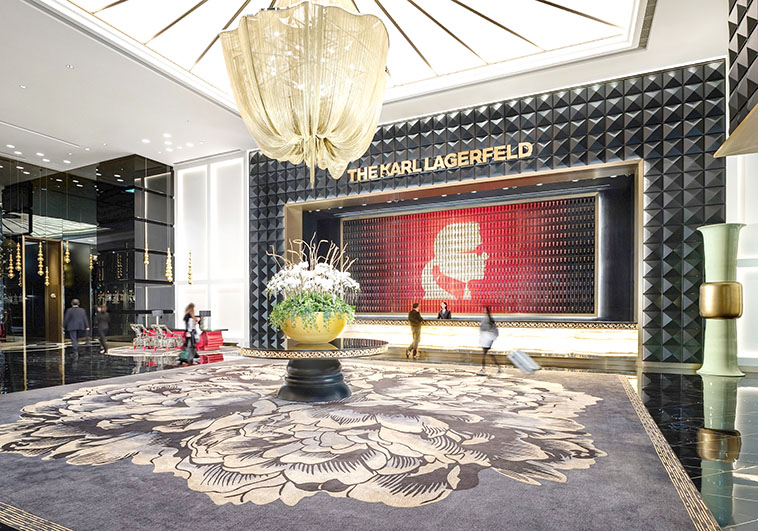THE KARL LAGERFELD澳門是全球唯一由國際知名的時尚大師 Karl Lagerfeld親自設計的奢華酒店大樓,從室內設計、傢具佈置以至牆壁掛畫,都由他精心構思。酒店大堂接待處牆上由逾千條鑰匙砌成的巨大「KARL Kameo」頭像震撼視野,一系列產自中國景德鎮的手工定製瓷器突顯考究的傳統中國工藝。酒店大樓提供271間格調非凡的客房和套房,特別訂製的傢具充滿古典氣息、區隔客房空間的中式月洞門設計精緻、牆身櫻花圖案引人入勝,藝術擺設滲透中國風元素,與西方藝術裝飾融為一體。