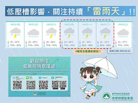 氣象局又稱,按現時的預報資料顯示,低壓槽將於下週持續影響華南沿岸,本澳下週的驟雨及雷暴天氣將進一步增多;在持續有雨的天氣下,下週的最高氣溫亦將有所緩和。