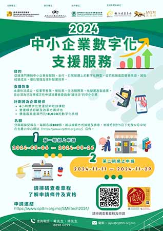 【特訊】為推動及支持本澳中小企業數字化轉型,經濟及科技發展局委託澳門生產力暨科技轉移中心承辦“2024中小企業數字化支援服務”,由5月6日起接受企業申請。生產力中心將透過培訓、診斷等方式,提升中小企經營者對科技工具的認識,協助其了解自身需求,進而提供適切的數字化工具或解決方案。是次計劃是去年先導計劃的延續,今年名額增加至600個,分開兩期執行,每期300個,分別於5月及11月接受申請。