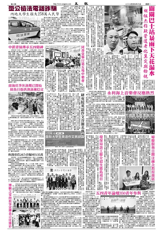 【特訊】今年是“五四運動”一百零五周年,習近平總書記寄語廣大青年繼承和發揚五四精神勉勵青年們要繼承和發揚“愛國、進步、民主、科學”的五四精神,並勉勵青年爭做有理想、敢擔當、能吃苦、肯奮鬥的新時代好青年,在推進家國及特區建設、民族復興偉業中展現青春作為、彰顯青春風采、貢獻青春力量。