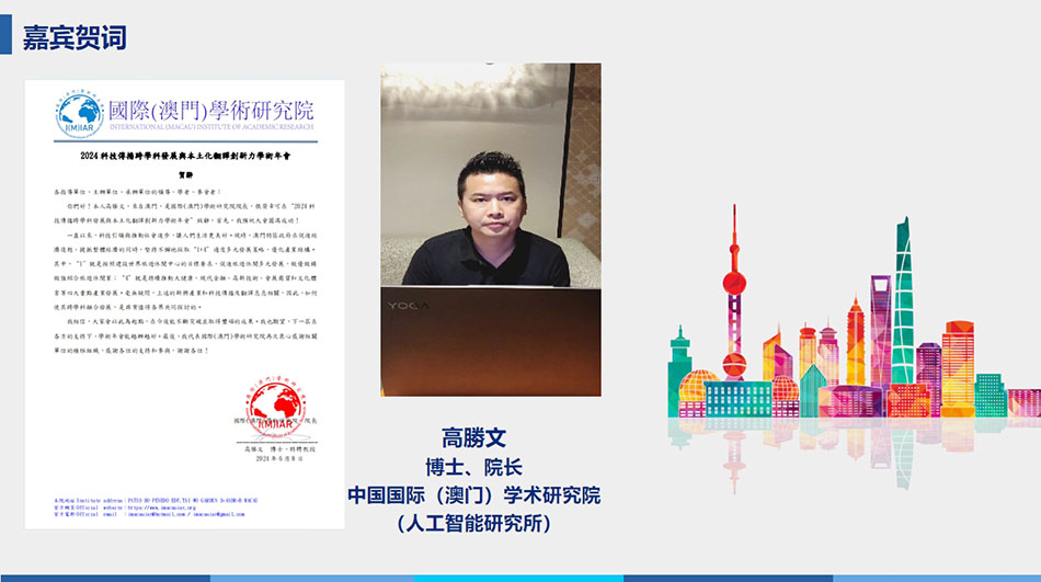【特訊】由中國翻譯協會翻譯服務委員會、上海市科學技術協會、上海市閔行區科學技術協會、華東師範大學指導,上海市閔行區翻譯協會主辦的“2024科技傳播跨學科發展與本土化翻譯創新力學術年會”在華東師範大學外語學院圓滿落幕,年會採用線上線下相結合方式進行,國際(澳門)學術研究院院長高勝文博士獲邀參會並致開幕賀辭。他建議借助人工智能推動跨學科融合發展,助力科技傳播。