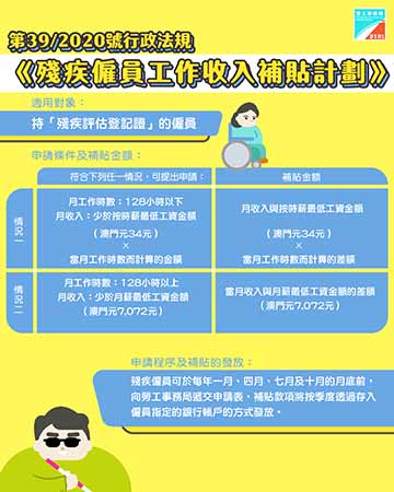 凡持有由社會工作局發出有效的殘疾評估登記證的本地僱員,如按月累計工作總時數少於128小時,且當月工作收入少於《僱員的最低工資》規定的每小時最低工資金額34澳門元乘以當月實際提供工作時數而計算的金額;又或符合按月累計工作總時數等於或多於128小時,且當月工作收入少於《僱員的最低工資》規定的每月最低工資金額7,072澳門元,均可作出申請。