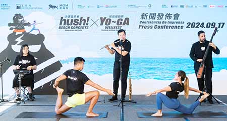 「hush!沙灘音樂會x Yo~ga瑜伽運動節2024」新聞發佈會昨日在澳門美高梅維天閣舉行,文化局局長梁惠敏、美高梅中國控股有限公司總裁及執行董事馮小峰、旅遊局代局長程衛東、市政署文康及公民教育廳廳長高佩珊、海事及水務局海事活動廳廳長黃文濤等主禮,文化局副局長鄭繼明及美高梅品牌策劃高級副總裁廖頴琦等出席。會上邀請本澳林澤誠爵士樂隊及thetiredeyes樂隊與水上瑜伽導師Vicky Yang及 Victor Chau進行聯乘演出。
