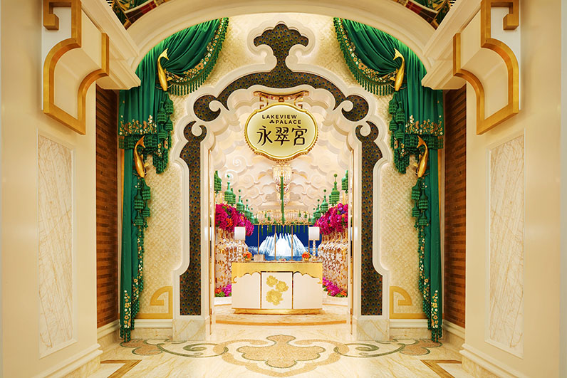 永翠宮的餐廳餐廳設計以金色和翡翠綠為主色調,奢華細節盡現婉約大氣的中式美感與雅緻格調, 讓賓客彷若置身風景如畫的江南水鄉,透過巨大的落地玻璃窗即可將湖景噴泉表演以及路氹城區 的璀璨景致都盡收眼底。無論是高朋滿座的慶典時刻,還是親友歡聚的溫馨時光,都能引領宾客 開啟一段令人难忘的江南賞味之旅。