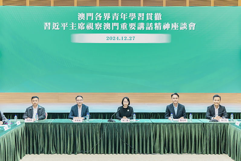 特訊】十二月二十七日下午七時,澳門各界青年組織活動籌備委員會在澳門科學館會議廳舉辦“澳門各界青年學習貫徹習近平主席視察澳門重要講話精神座談會”。澳門特別行政區政府社會文化司司長柯嵐,中央人民政府駐澳門特別行政區聯絡辦公室教育與青年工作部部長李雪飛,澳門特別行政區政府教育及青年發展局局長龔志明、副局長黃嘉祺,以及澳門青年社團和青年代表近二百人出席。澳門各界青年組織活動籌備委員會主席、澳門青年聯合會會長羅奕龍主持座談會。