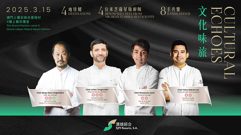 【特訊】澳娛綜合度假股份有限公司(「澳娛綜合」)將於3 月 15 日在旗下澳門上葡京綜合度假村內瑰麗典雅的上葡京禮堂,呈獻由《米芝蓮指南》主理的「Cultural Echoes 文化味旅」星級饗宴,四位來自世界各地、擁有獨特文化底蘊的米芝蓮星級餐廳主廚,將精心炮製融合傳統口味與創新技藝、風味誘人的六道風味佳餚,為饕客呈獻一場別具心裁的跨文化味蕾盛宴。