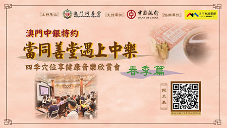 【特訊】由同善堂主辦、澳門中銀支持、澳門有線電視協辦的「當同善堂遇上中樂」音樂欣賞會主題——「四季穴位享健康」,第三場音樂會「春季篇」將於三月一日在同善堂歷史檔案陳列館舉行,續由本地青年中樂團演奏與時節相關的樂曲、以及同善堂中醫生講解符合春季的中醫穴位知識,持續以藝術的角度向公眾推廣我國優秀中華傳統文化。