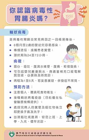 綜合上述監測資料顯示,本澳急性胃腸炎感染仍處於活躍階段。急性胃腸炎通常可由病毒或細菌等不同致病原引起,常見病原體包括諾如病毒(諾沃克樣病毒)、輪狀病毒、沙門氏菌等。潛伏期由數小時至數日不等,因不同致病原而有所不同。一般病情較輕,致病原須由實驗室檢測才能證實,治療以對症支持為主。