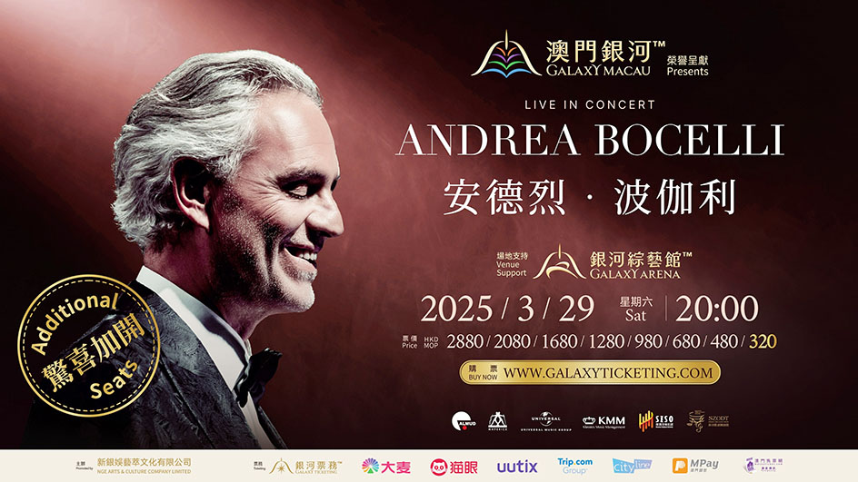 「澳門銀河™」榮譽呈獻: ANDREA BOCELLI Live in Concert,時間: 2025 年 3 月 29 日, 晚上 8 時,地點: 銀河綜藝館,主辦單位:新銀娛藝萃文化有限公司。