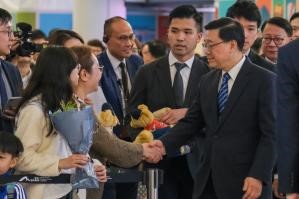 【中新社香港4月10日電】(記者 韓星童)香港特區救援隊完成緬甸地震救援任務返港,香港特區政府9日晚在香港國際機場為隊員舉行迎接儀式。 當日22時許,香港特區行政長官李家超在香港國際機場迎接特區救援隊一行,並逐一與隊員們握手。