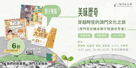“美味歷奇──穿越時空的澳門文化之旅”親子閱讀分享會乃“澳門歷史文化兒童繪本”之延伸活動,該套繪本由澳門基金會及其歷史文化工作委員會出版,冀以啟發思維的故事帶出澳門本土文化,並配以精美插圖及傳播中華歷史文化的小知識。叢書現已出版三冊,包括望風著、林偉敬繪的《去茶樓》,譚健鍬著、杜駿偉繪的《鬥雞》,黃健威及三十三合著、尹應明繪的《尋找大將軍》。上述分享會將於4月27日(星期日)下午3時至4時半在塔石體育館書展講座區舉行,名額有限,先到先得,歡迎市民踴躍參與。留座請把姓名及人數電郵至da_info@fm.org.mo,如果更多查詢,可致電8797 8538。