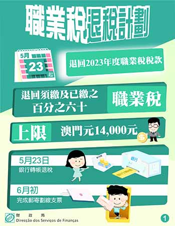 納稅人可自5月23日起透過以下渠道查閱2023年度職業稅退稅計劃資料:財政局移動應用程式“澳門稅務資訊Macau Tax”、一戶通或商社通;財政局電子服務;財政局及身份證明局的自助服務機;或親臨財政局三個服務點。