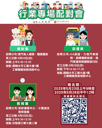 如有查詢,可於辦公時間內致電勞工局就業廳關先生(電話:8399 9856)或金沙中國招聘熱線(電話:8118 6293)。