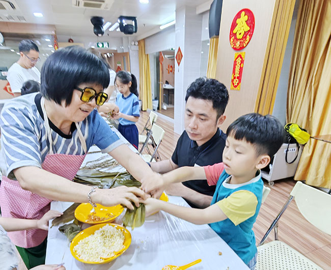 在等待粽子煮熟的過程中,親子們還製作了紀念卡,準備贈予長者。最後,親子在婦女義工的帶領下,將煮好的粽子和紀念卡親自送到獨居長者的手中,同時送上祝福和問候,長者們對此表示高興和感恩。