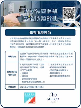 【特訊】為有意投身物業服務範疇的本澳居民,提供全方位的培訓及事業發展機會,勞工事務局(下稱“勞工局”)和新濠博亞娛樂有限公司(下稱“新濠博亞”)合作推出“新濠博亞娛樂基礎躍進計劃—物業服務技師”(下稱“計劃”),以“先入職、後培訓”方式,為有興趣從事物業服務範疇的本澳居民,提供全方位的培訓及事業發展機會,計劃由6月20日起接受申請。