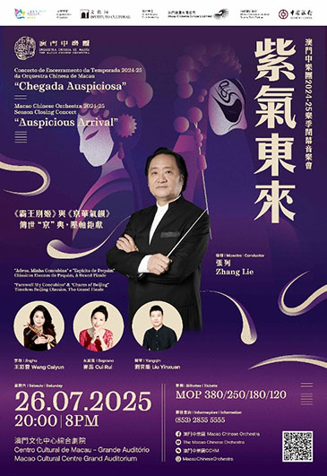 【特訊】澳門中樂團2024-25樂季閉幕音樂會《紫氣東來》將於7月26日(周六)晚上8時在澳門文化中心綜合劇院舉行。澳門中樂團音樂總監兼首席指揮張列將帶領澳門中樂團,聯同京胡演奏家王彩雲、揚琴演奏家劉音璇及女高音崔蕊,以國樂經典和京劇傳奇交織成動人心弦的華彩樂章,為觀眾呈現音樂名家的絕代風華。