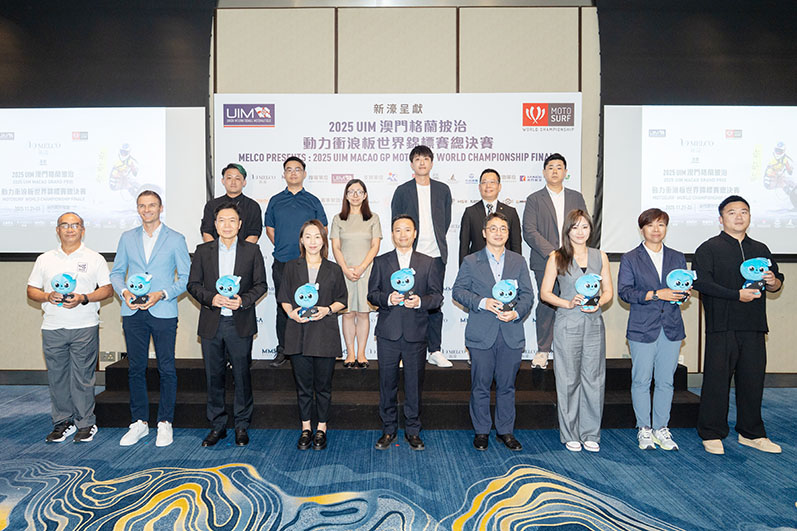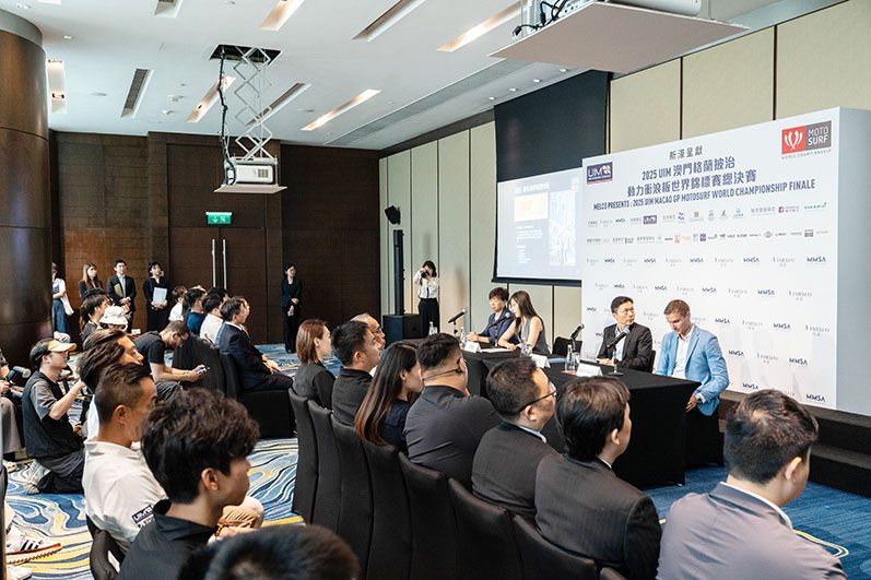 主辦單位今天於新濠天地舉行新聞發布會,公布澳門格蘭披治動力衝浪板世界錦標賽總決賽的詳情。體育局澳門格蘭披治大賽車及大型體育活動廳廳長黃家權、旅遊局旅遊產品及活動廳廳長葉頴珊、海事及水務局海事服務處代處長劉社敬、新濠董事鍾玉文、澳門動力衝浪板協會會長何雅盈、UIM國際摩托艇聯盟委員會成員兼動力衝浪板世界錦標賽總監Martin Jančálek及萬達體育集團總裁張梅出席了新聞發布會。