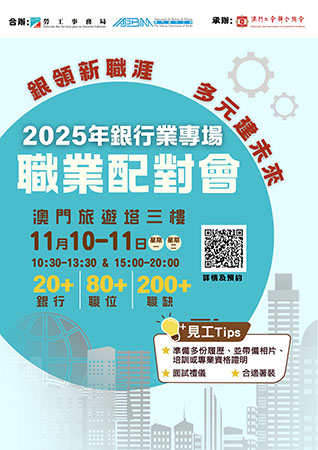 【特訊】為協助有意投身銀行業的本地居民對接就業機會,並培育及發掘本地銀行業的人才,勞工事務局(下稱“勞工局”)與澳門銀行公會合辦“2025年銀行業專場職業配對會”。活動將於2025年11月10日至11日,一連兩日在澳門旅遊塔會展娛樂中心三樓舉行,逾20間本地銀行參加,提供超過200個文職及其他職位空缺,有意參加的澳門居民可於即日起至11月7日中午12時進行網上預約。