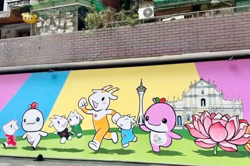 塗鴉牆採用鮮艶活潑的色彩,有點復古的味道;歷年吉祥物們一起劃龍舟、舞龍、傳遞火炬,完成跨越時空的連接。