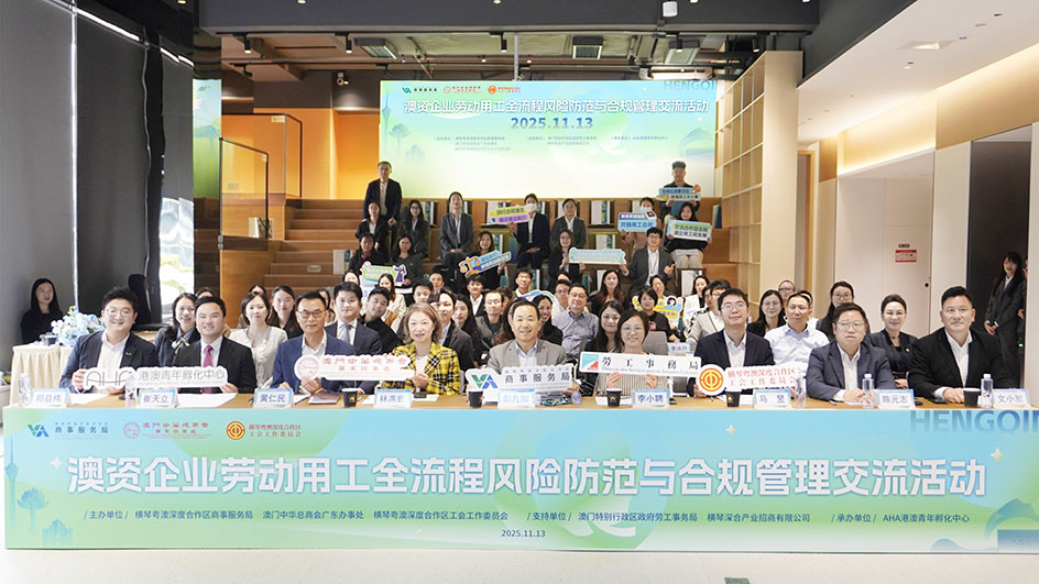 【特訊】為助力橫琴合作區澳資企業搭建勞動用工法律風險防控體系,築牢企業可持續發展用工根基,橫琴合作區商事服務局、澳門中華總商會廣東辦事處、橫琴合作區工會工作委員會於11月13日順利合辦“澳資企業勞動用工全流程風險防範與合規管理交流活動”。本次活動獲澳門特區政府勞工事務局、橫琴深合產業招商有限公司作支持單位,並由AHA港澳青年孵化中心承辦,邀澳資企業代表等八十餘人出席,場面熱烈。合作區商事服務局副局長彭九如,合作區工會工作委員會副主席馬昱,澳門特區政府勞工局勞動監察廳廳長李小娉,澳門中總副理事長兼婦委會主任林燕妮、常務理事兼廣東辦代表黃仁民、常務理事兼青委會主任崔天立等出席活動。