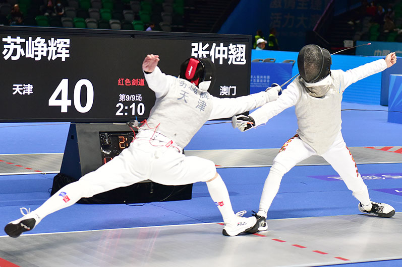 全運劍擊男子花劍團體賽,澳門代表隊派出林柏翹、張仲翹、胡頌謙、許文傑迎戰天津,率先亮相的林柏翹對蘇崢輝,以2比0強勢開局,但對手後來居上,澳門落後3比5,接著上陣的張仲翹同樣受到不少壓制,未能收窄差距,落後三分之下交給胡頌謙,但這局未能在對手身上取得分數,團體賽共打九局,每局打五劍,鬥三分鐘,最快取得45分或九局完成後,得分高者獲勝,澳門四局過後落後10比20,沒有退路之下奮力一搏,不過許文傑力挽狂瀾亦僅得三分,澳門隊並未氣餒,稍後張仲翹和林柏翹都分別取得四分,但不足以衝擊天津,澳門落後18分進入最後一局,要追已經很困難,張仲翹頂住壓力,收獲八分都未能反撲,結果澳門總成績30比45不敵天津,在十六強止步。