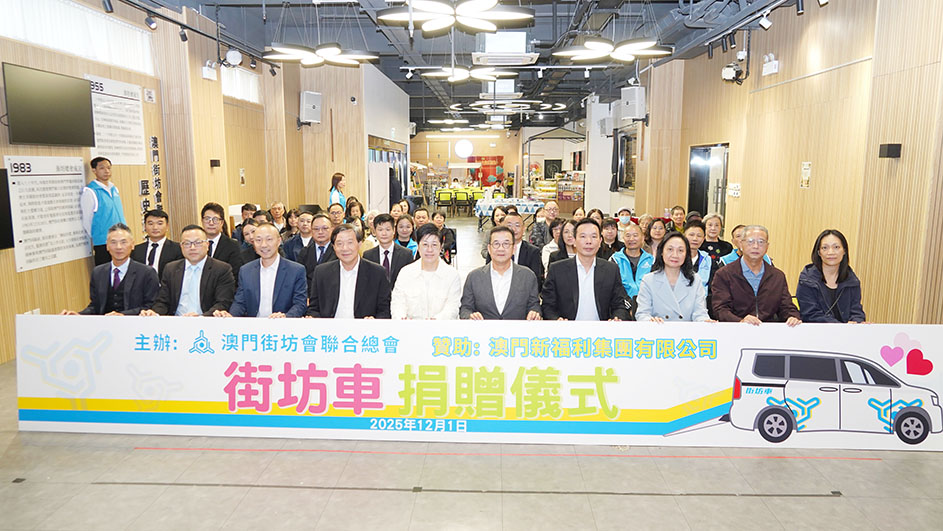 「街坊車」捐贈儀式昨午假街總社區服務大樓舉行,社會工作局復康服務處代處長蘇志群、新福利集團有限公司董事長廖僖芸、董事曾云強、總經理鄭妙嫻,以及街總會長吳小麗、理事長陳家良等負責人及服務使用者代表出席。