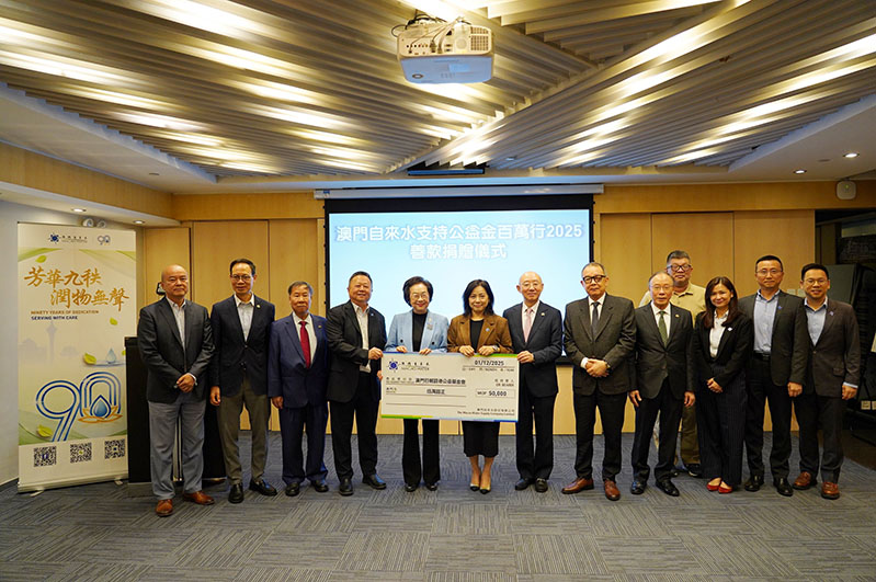 為支持12月14日舉行的公益金百萬行活動,公司於12月1日假青洲水廠行政大樓向澳門日報讀者公益基金會捐出五萬澳門元善款,用以幫助弱勢社群,由執行董事關小冰代表致送,由會長賀定一代表接收。出席儀式的代表亦包括澳門日報讀者公益基金會副會長陸波、飛安達、許建章,理事長黃國勝,副理事長崔家榮、李廣志、梁永佳,以及澳門自來水副總經理朱偉文、王榮集、李志土,財務總監何美儀等。